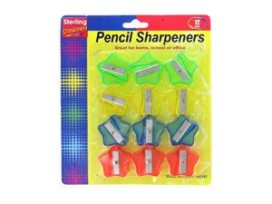 Star-shaped pencil sharpeners are perfect for home, school or office. Each pack comes with 12 sharpeners in transparent orange, blue, yellow and green. Also make great loot bag prizes. Sharpeners are packaged on a blister card with hanging hole. Each sharpener measures 1 3/16.
