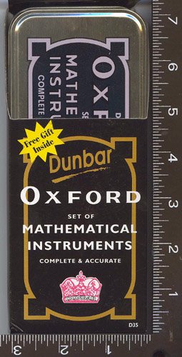 - GEOMETRY, ITEMS, MATHEMATICAL INSTRUMENTS, DRAFTING KITS, STUDY, TOOLS, 1, TIN CONTAINER, SET, of, DUNBAR, OXFORD, ITEMS, COMPLETE & ACCURATE, WITH, COMPASS, DIVERS, 2 PENCILS, 1-3.5" 1-6", RULER 6", 45 & 60 degree, SET SQUARES, 180 degree, PROTRACTOR, ERASER, PENCIL SHARPENER, ETC., SHADE, SHADES, UPC